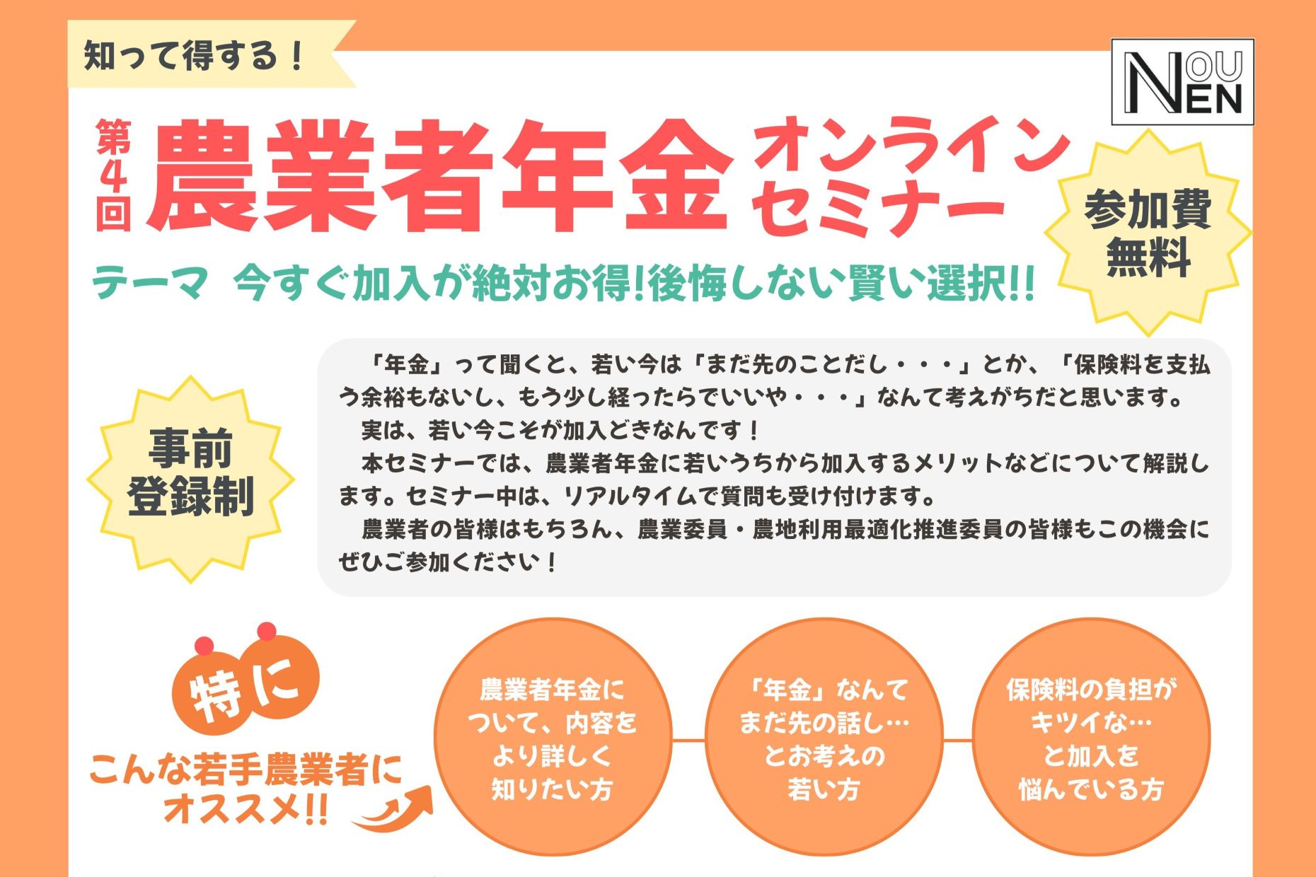独立行政法人農業者年金基金では、「今すぐ加入が絶対お得! 後悔しない賢い選択!!」をテーマに、第4回農業者年金オンラインセミナーを下記のとおり開催されます。
