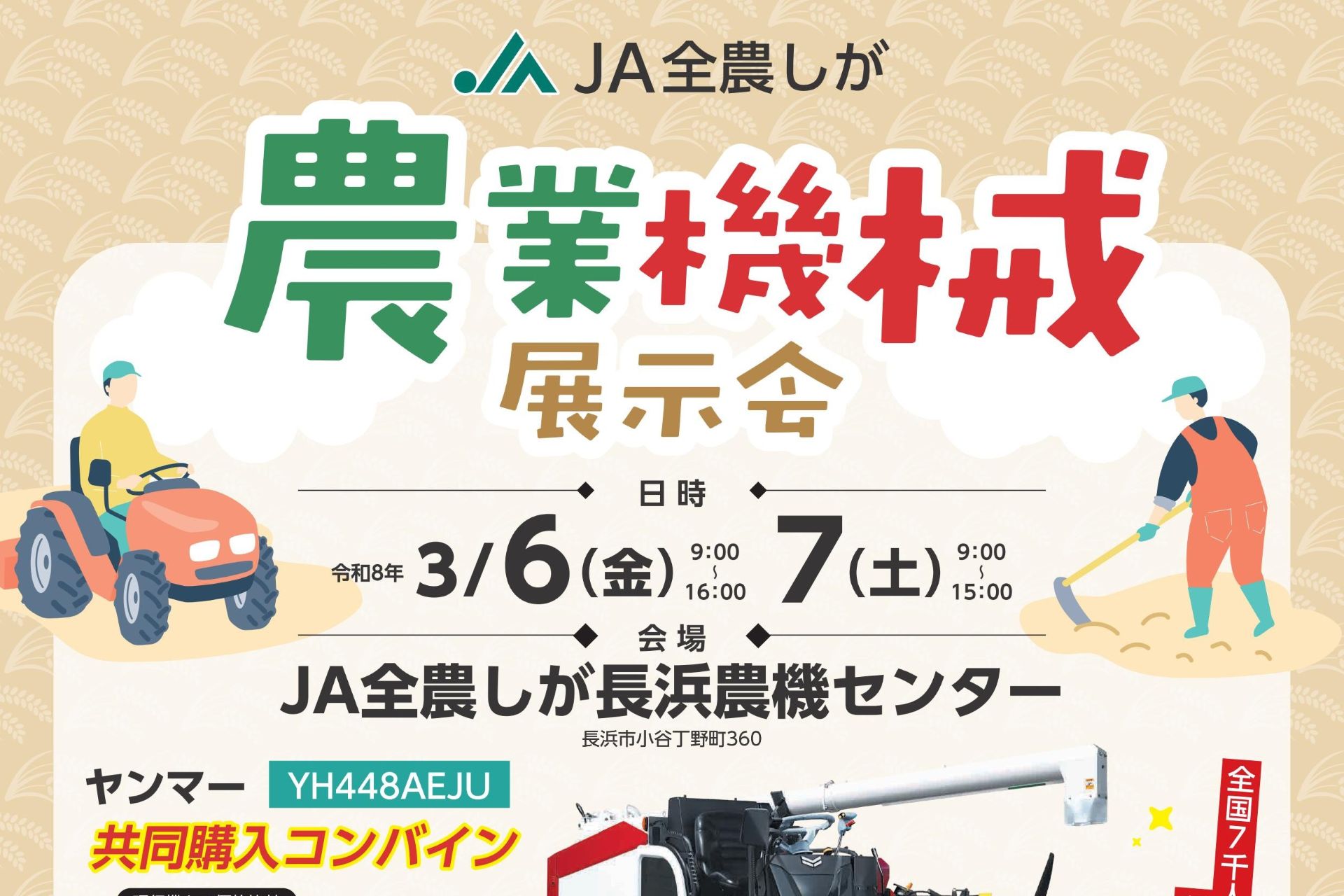 JA全農しが長浜農機センターでは、農業機械展示会を下記の通り開催されます。