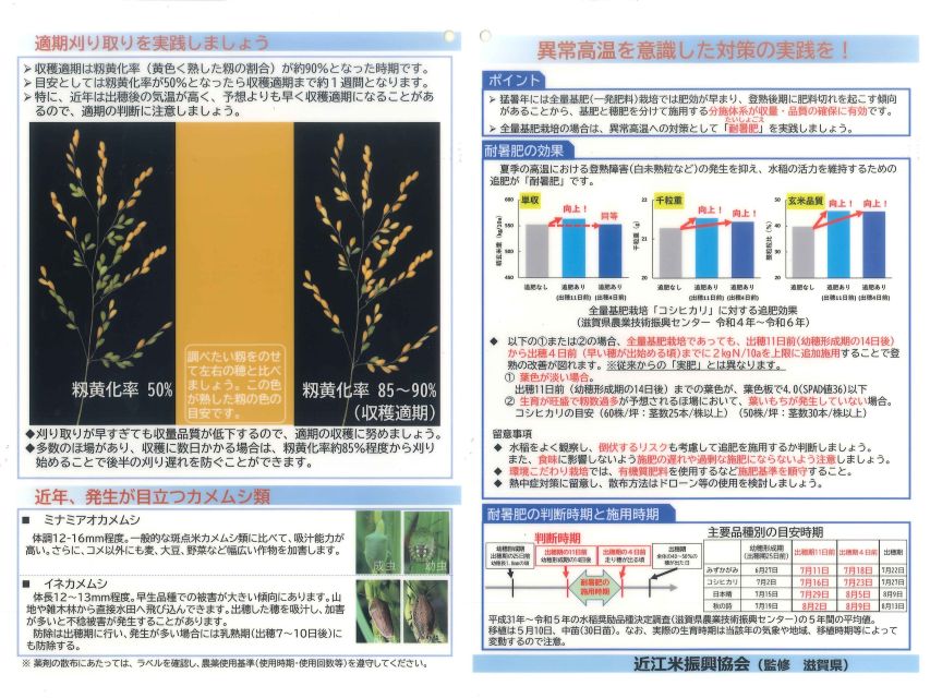 近江米振興協会において、水稲の適正な収穫時期の判断や、高温対策の実践に役立つ「水稲収穫適期下敷き」が作成されました。