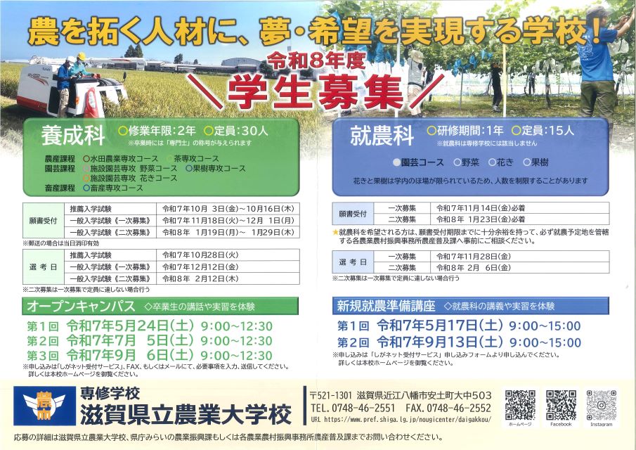 滋賀県立農業大学校では、下記学生募集案内の募集要領のとおり次年度の募集がおこなわれます。