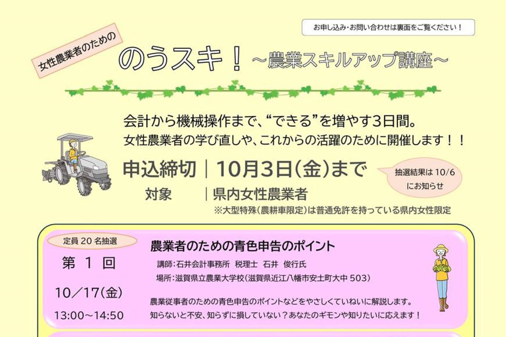 滋賀県では、女性農業者の学び直しや、これからの活躍のために「のうスキ!~農業スキルアップ講座~」を下記の通り開催されます。