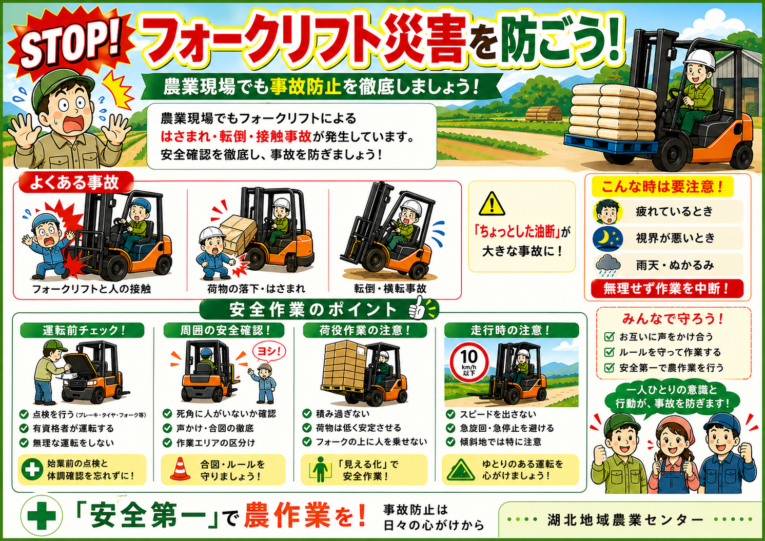 忙しい時期だからこそ、「確認する」「無理をしない」「安全を最優先する」ことを徹底し、安全で安心な農作業の実施をお願いします。